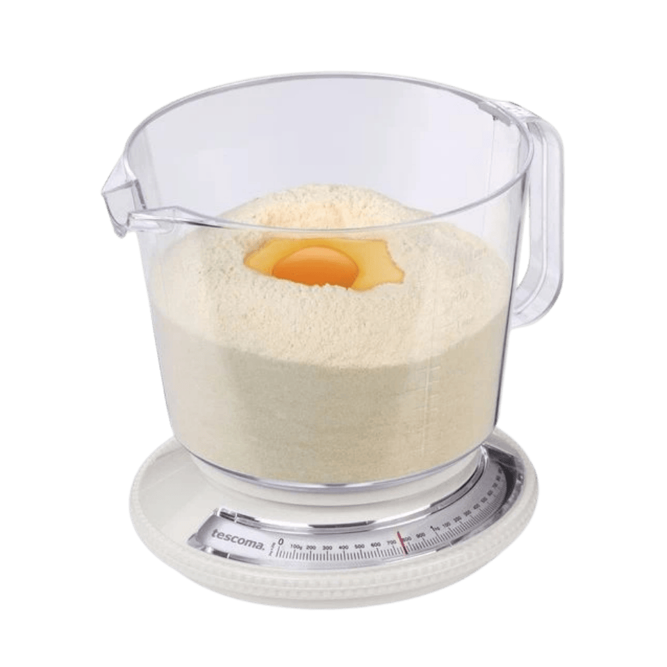 Zuverlässige mechanische Waage mit Tara-Funktion – ideal zum Wiegen mehrerer Zutaten in einer Schüssel.