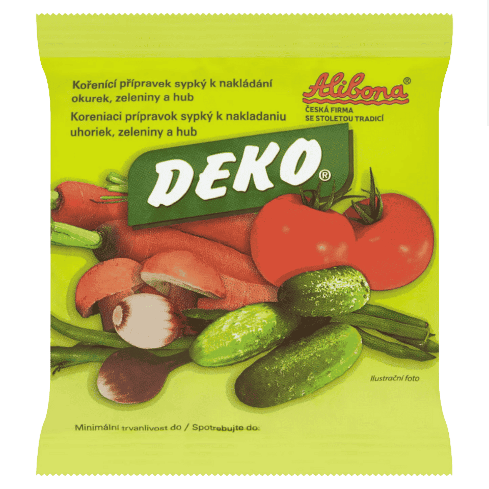 Alibona DEKO ist eine Gewürzmischung zum Einlegen von Gurken, Gemüse und Pilzen. Damit können Sie ganz einfach köstliche hausgemachte Gurken und eingelegtes Gemüse zubereiten. Dieses traditionelle tschechische Produkt von Alibona, einem Unternehmen mit jahrhundertealter Tradition, sorgt dafür, dass Ihre Einlegegerichte immer aromatisch und authentisch sind.