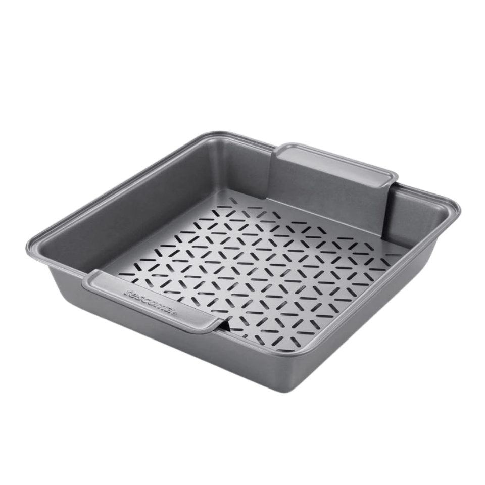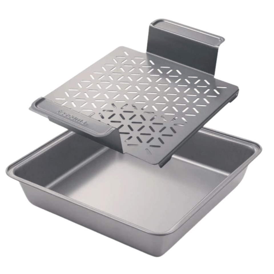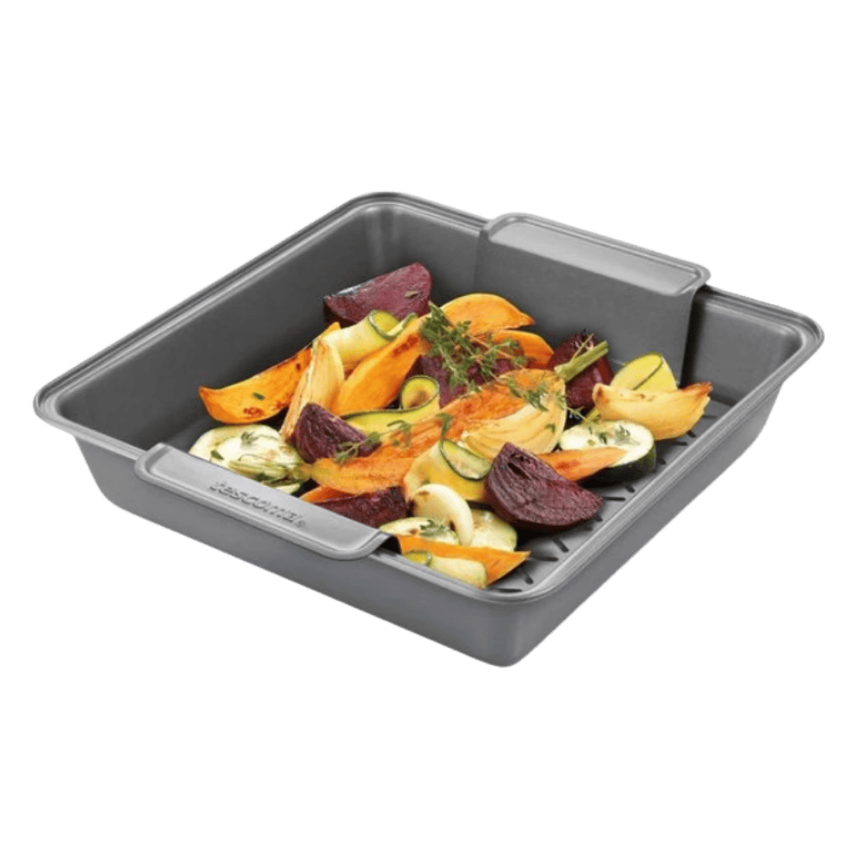 Auf diesem kompakten Backblech mit herausnehmbarem Rost können Sie Fleisch, Geflügel und Gemüse bei perfekter Luftzirkulation und für saftige Ergebnisse braten.