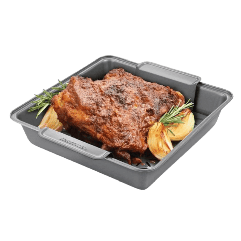 Verwenden Sie das Blech mit dem Rost zum Begießen und langsamen Braten oder ohne Rost zum normalen Backen. Aus robustem Metall mit Antihaftbeschichtung für einfache Reinigung.