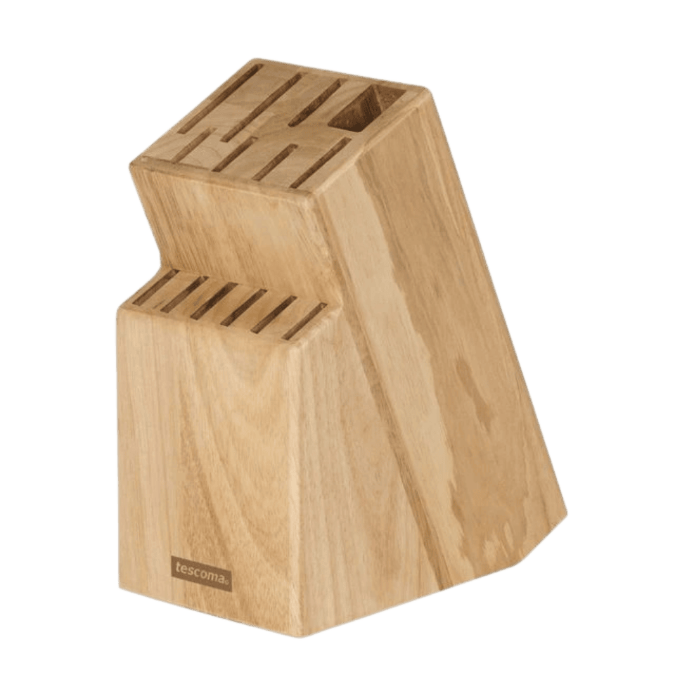 Halten Sie Ihre Küchenutensilien mit dem Tescoma WOODY-Block aus strapazierfähigem brasilianischem Gummibaumholz organisiert.