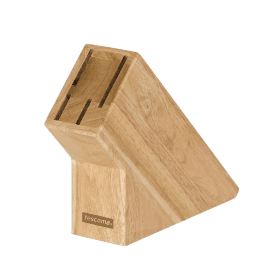 Bewahren Sie Ihre Lieblingsmesser sicher im kompakten Tescoma WOODY-Block auf, der aus hochwertigem brasilianischem Gummibaumholz gefertigt ist.