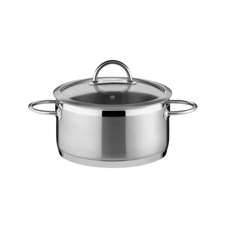 Aus hochwertigem Edelstahl mit massivem Sandwichboden für optimale Wärmeverteilung, Deckel aus Glas und Edelstahl sowie robusten Griffen. Für alle Herdarten geeignet, auch Induktion. Spülmaschinenfest. 10 Jahre Garantie.