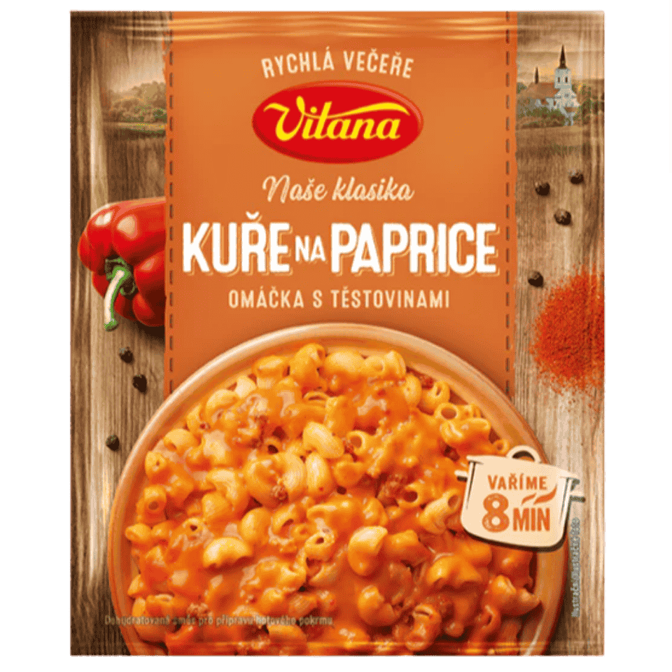 Genießen Sie in wenigen Minuten ein traditionelles tschechisches Lieblingsgericht! Vitana Quick Dinner Chicken Paprika kombiniert cremige Paprikasauce mit Grießnudeln und kreiert so eine köstliche und praktische Mahlzeit, die in nur 10 Minuten fertig ist.
