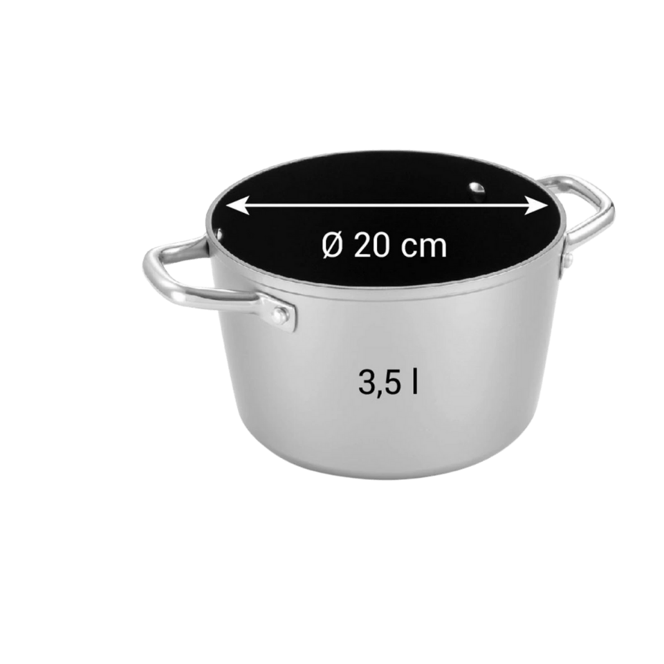 Dieser 3,5-l-Topf aus robustem Aluminium mit hochwertiger Antihaftbeschichtung erhitzt sich schnell, verzieht sich nicht und eignet sich ideal für Suppen, Eintöpfe und Eintopfgerichte. Geeignet für alle Herdarten und den Backofen. Die Edelstahlgriffe verleihen dem Topf einen professionellen Touch und sorgen für lange Haltbarkeit.