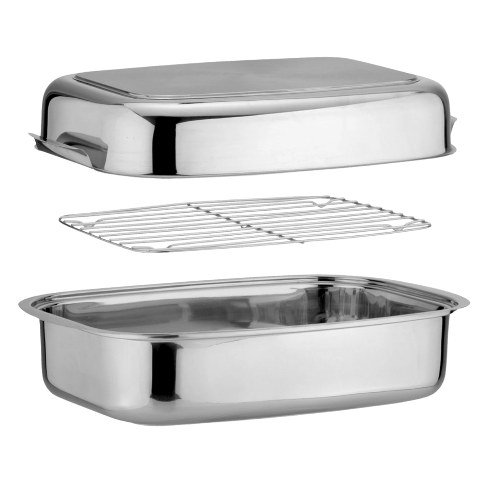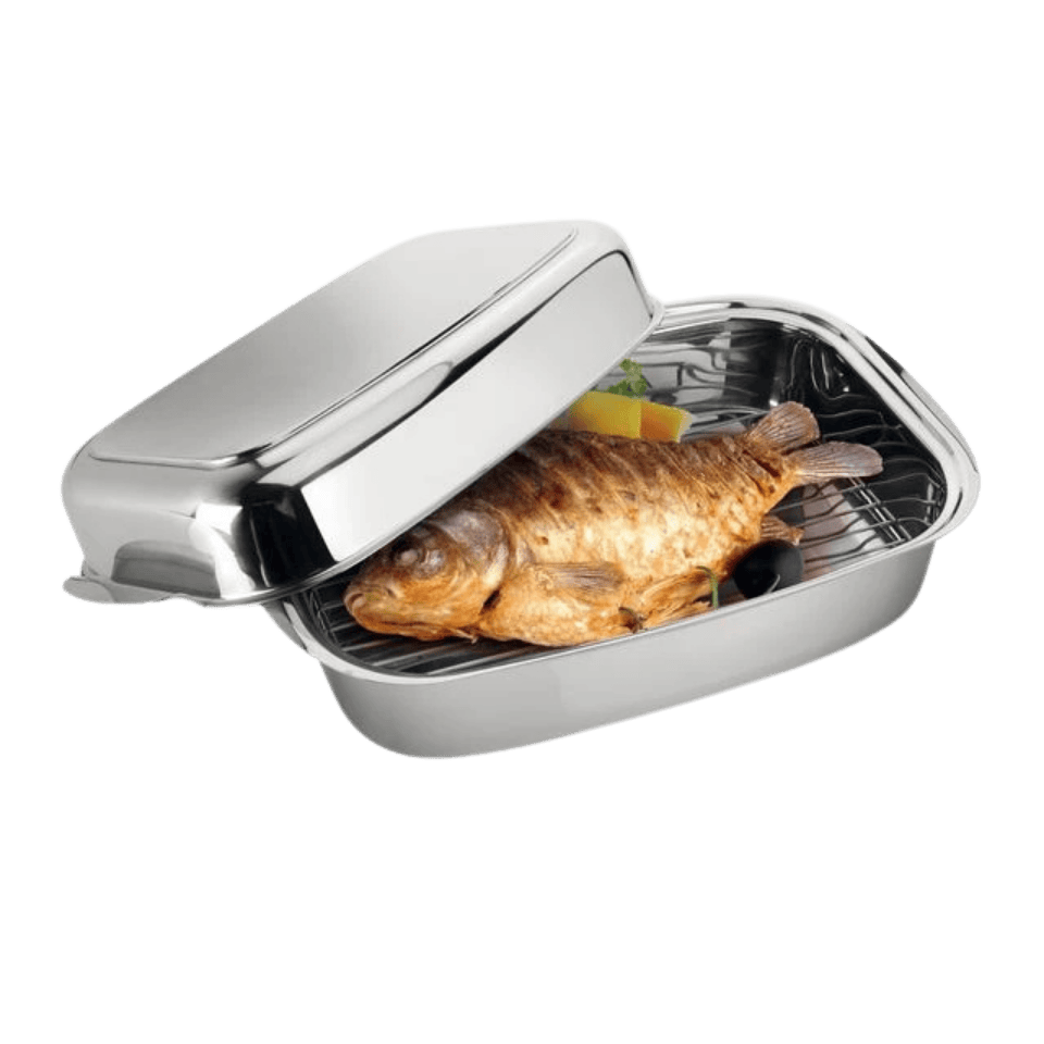 Dieser Bräter aus hochwertigem 18/10 Edelstahl mit robustem Sandwichboden bietet eine hervorragende Wärmeverteilung. Die hochglanzpolierte Oberfläche verleiht ihm einen Hauch von Eleganz, und die großen Griffe gewährleisten eine sichere Handhabung. Der Deckel dient gleichzeitig als flache Brat- oder Warmhalteform – perfekt für vielseitiges Kochen.