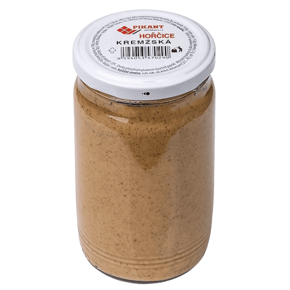 Erleben Sie den vollen und kräftigen Geschmack von Pikant Kremžská Senf, einem klassischen tschechischen Senf aus weißen und schwarzen Senfkörnern, Essig und einer leichten Süße. Bekannt für seine grobe Textur und sein ausgewogenes Aroma, passt dieser Senf perfekt zu Wurst, Fleisch und herzhaften tschechischen Gerichten. Er verfeinert auch Saucen, Marinaden und Dressings und ist daher ein Muss in jeder Küche.