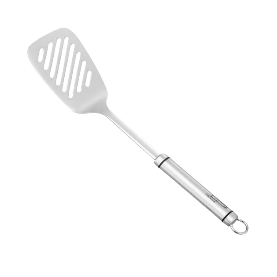 Dieses vielseitige Küchenwerkzeug aus hochwertigem Edelstahl eignet sich perfekt zum Wenden und Anheben von Lebensmitteln, während überschüssiges Öl oder Flüssigkeit durch den geschlitzten Kopf abgelassen wird. Mit seinem schlanken Design und der professionellen Verarbeitung ist es ideal für das tägliche Kochen oder Servieren direkt aus der Pfanne.