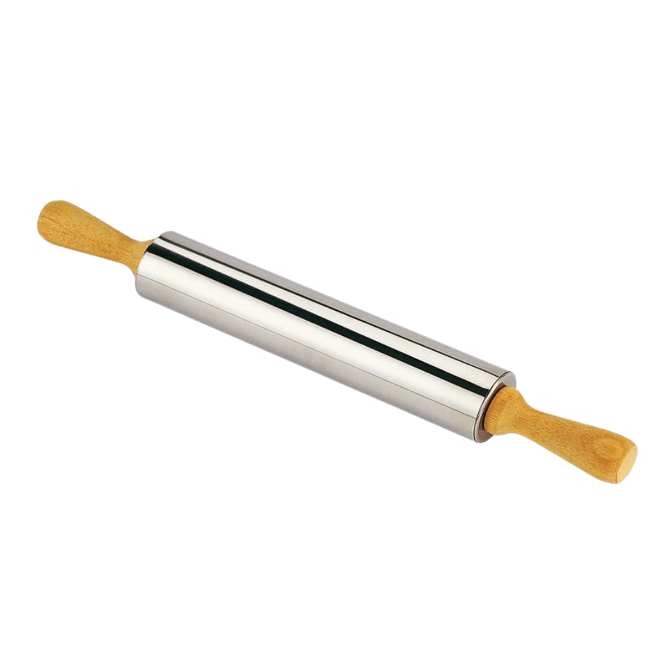 Dieses Nudelholz aus hochwertigem Edelstahl mit robusten Holzgriffen ermöglicht müheloses Ausrollen von Teig ohne Anhaften.