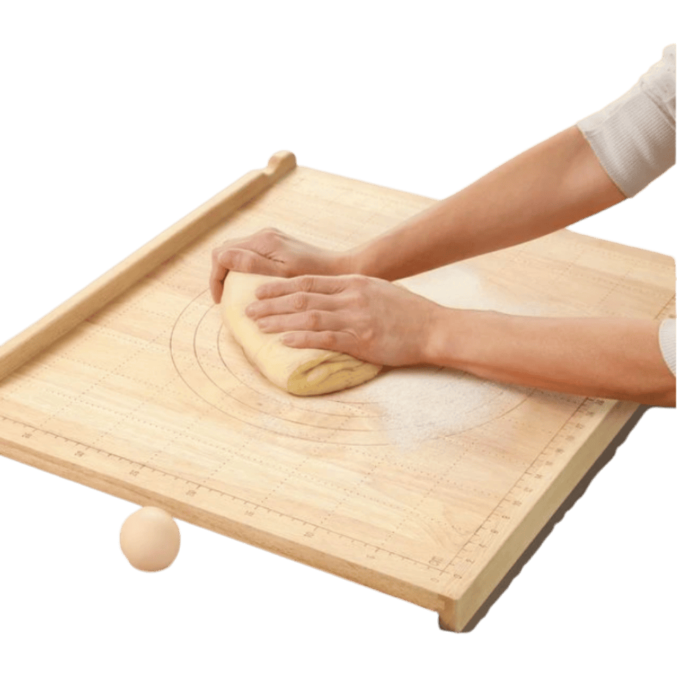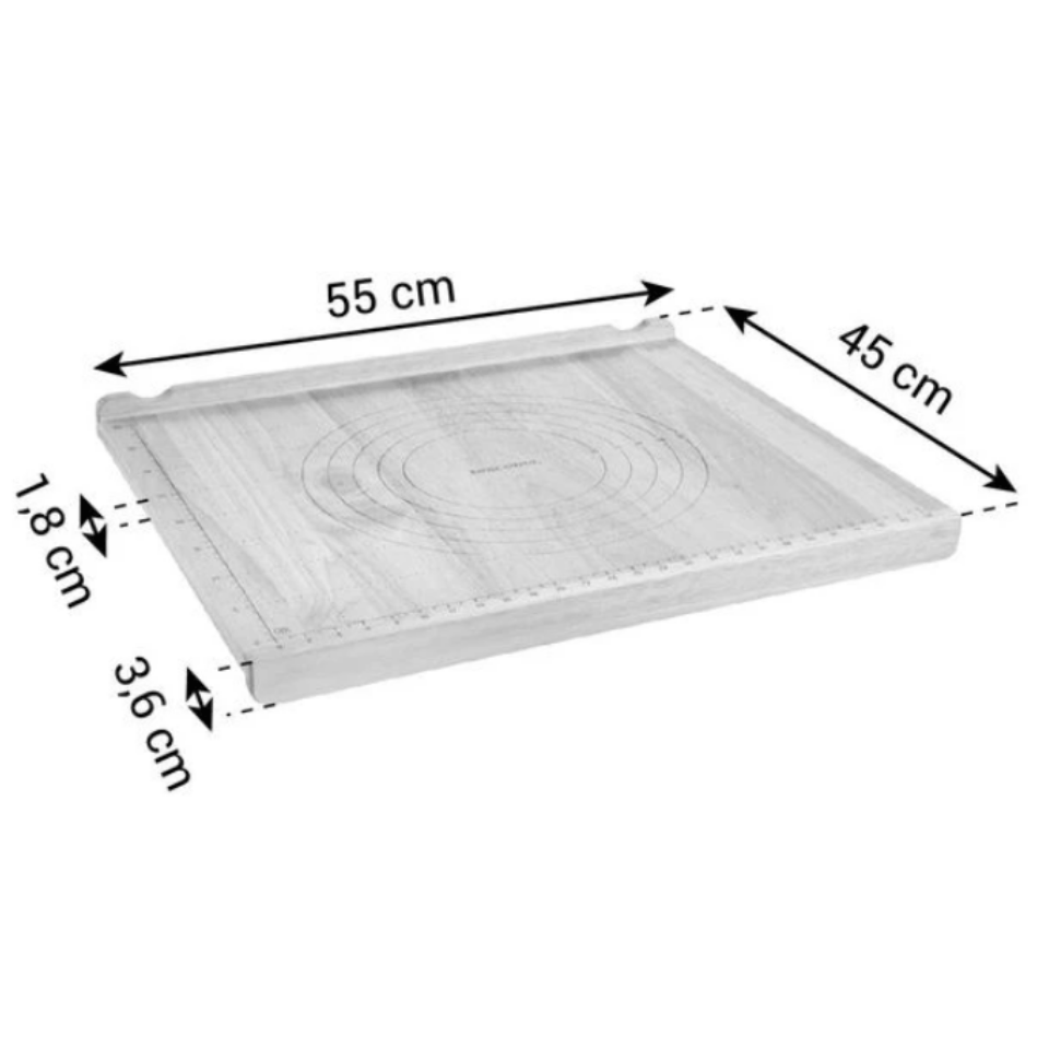 Dieses traditionelle Teigbrett aus Holz ist perfekt für ambitionierte Bäcker, die Wert auf robustes und zuverlässiges Werkzeug legen. Mit Messmarkierungen und erhöhten Kanten sorgt es für Komfort und Präzision bei der Teigzubereitung.