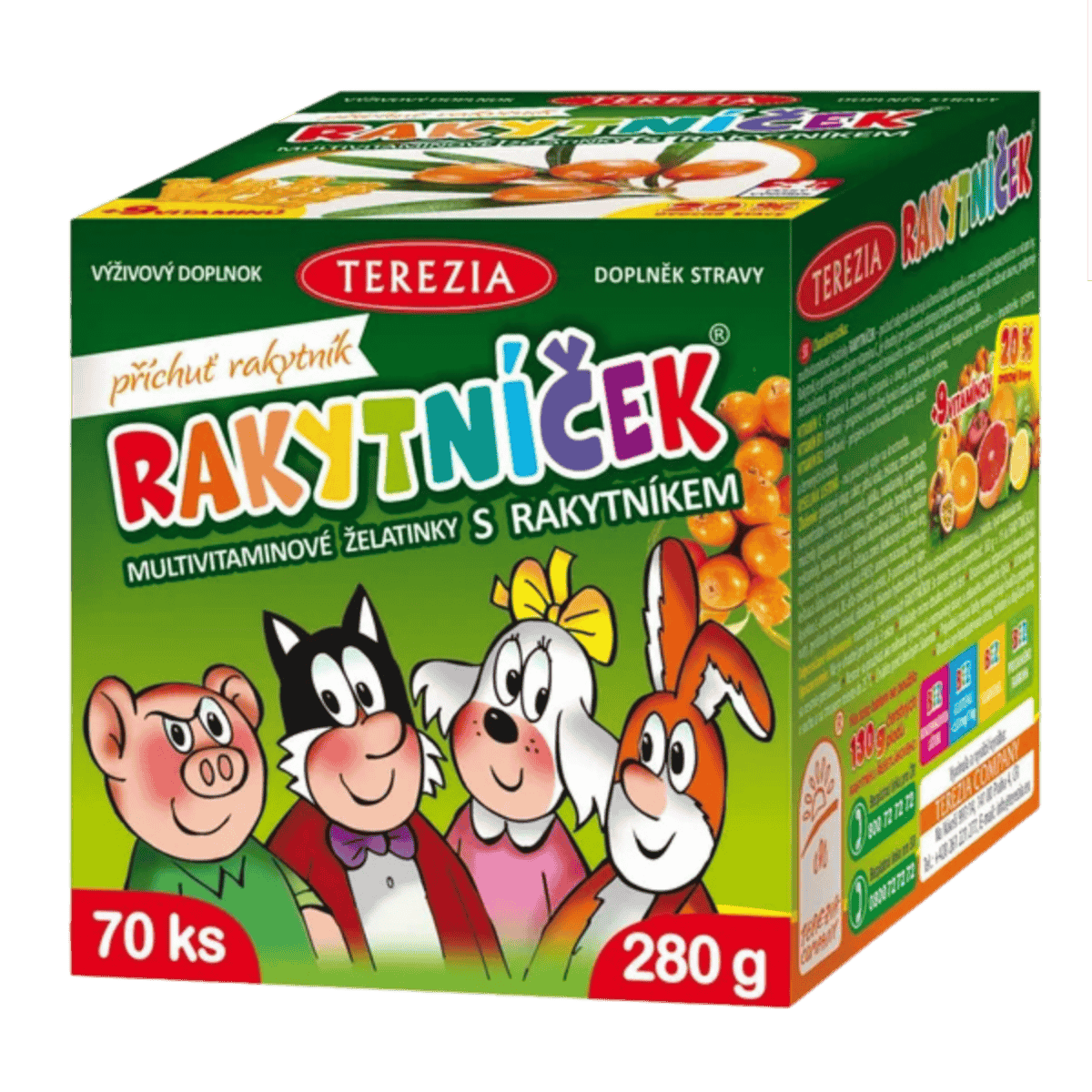 Enjoy fruity fun with Rakytníček Multivitamin Gummies Čtyřlístek – tasty gummies in the shape of legendary Czech cartoon characters. With 20% fruit juice, sea buckthorn, and 9 essential vitamins, these gummies support kids’ immunity, heart health, energy, digestion, and skin vitality. A daily treat without preservatives, artificial colors, or sweeteners.