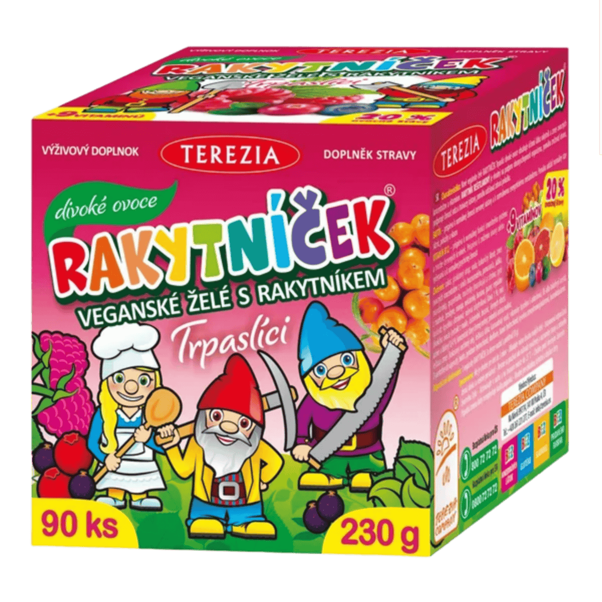 Discover fruity wellness with Rakytníček Vegan Gummies Divoké ovoce – juicy multivitamin jellies in the shape of cute dwarfs. With sea buckthorn, wild berry extracts, and essential vitamins, they support immunity, digestion, energy, and skin vitality. 100% vegan, without preservatives, artificial colors, or sweeteners.